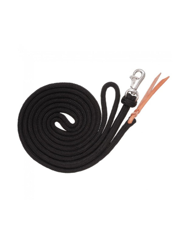 Cette longue laisse d'entraînement est faite de corde de yachting solide et de haute qualité, parfaite pour travailler les chevaux au sol. La laisse est livrée avec une extrémité en cuir attachée et dispose d'un solide mousqueton Triggerbull nickelé. 14' longueur