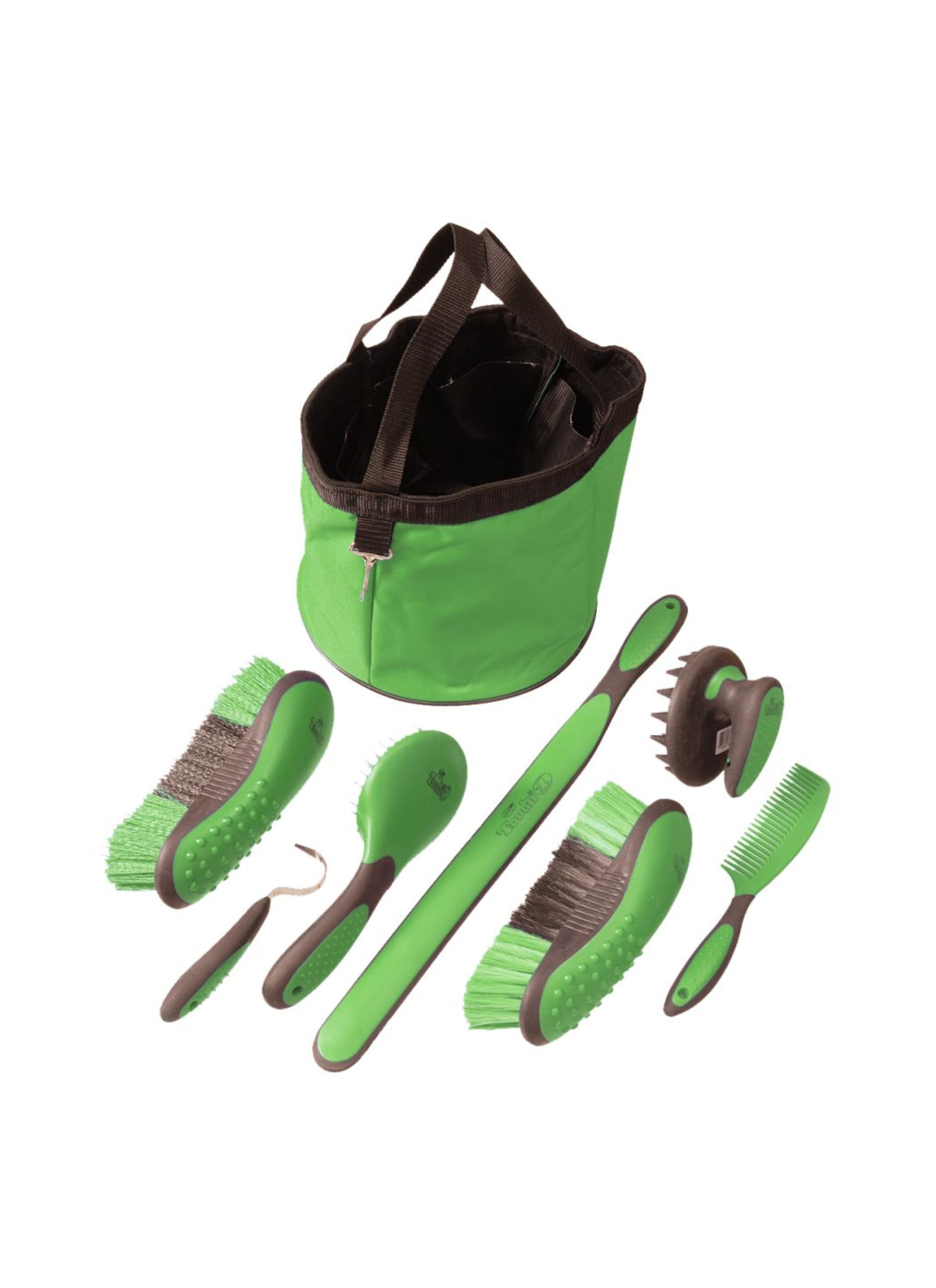 Sept articles de toilette ergonomiques, le tout dans un fourre-tout en nylon résistant. Comprend : brosse dure, brosse de finition, cure-pieds, curry, brosse pour la queue et la crinière, peigne et grattoir à sueur.