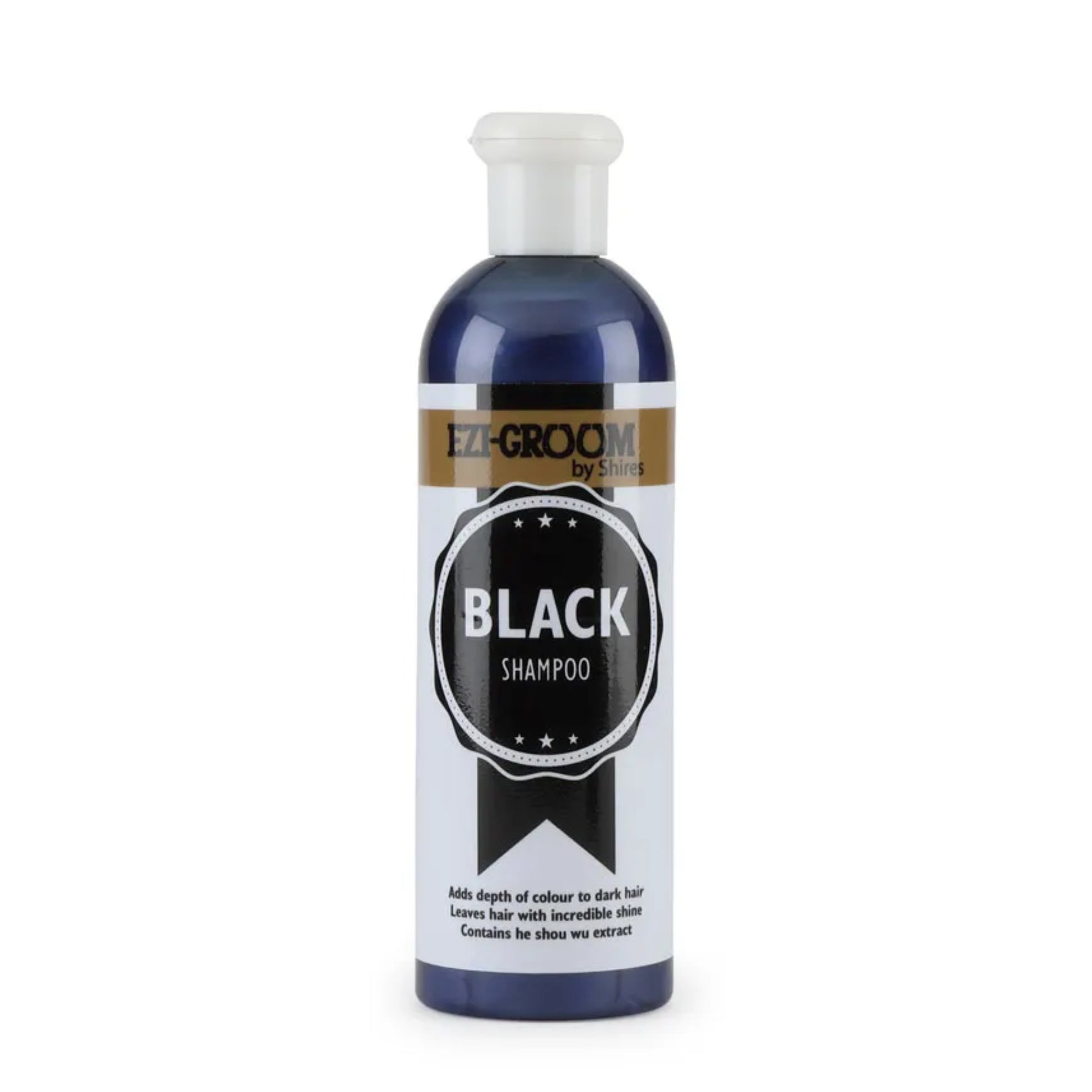 Luxurious shampoo containing he shou wu extract which helps to restore black or dark coloured coats. This special ingredient adds depth to the natural pigment of the hair in black or dark brown coats. Leaves an incredible shine and rich colour, while cleansing the hair of dust, dirt and oils. From the growing range of EZI-GROOM horse care products.