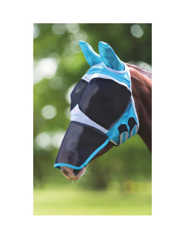 These fine mesh fly masks offer protection against the smallest of flies and midges. FEATURES: 3D contour frame over eyes. Secure fly proof mesh shield. Sun shade visor system. Contour comfort fit. Anti-rub binding tech. Easy care fabrics. Airstream ears. Quick fit secure straps. Durable for the field. Designed in the UK. Used by winners. 5 star fit. 70+% UV blocking, helping to diminish the risk of sunburn and sun bleaching. Minimum rating 60+% for eye and nose mesh. Effectiveness may diminish over time. Test carried out in accordance to BS EN 13758-I-2002+AI:2006.