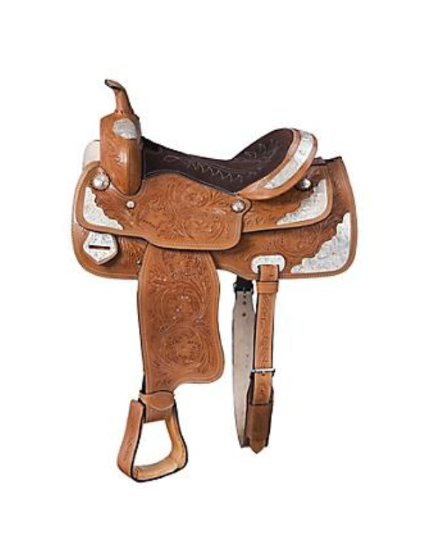 L'ensemble McCoy Trail Saddle comprend des outils floraux avec des accents de superposition argentés, des sièges en daim et des conchos argentés. Les garde-boue argentés et les garde-boue bruts complètent le look.