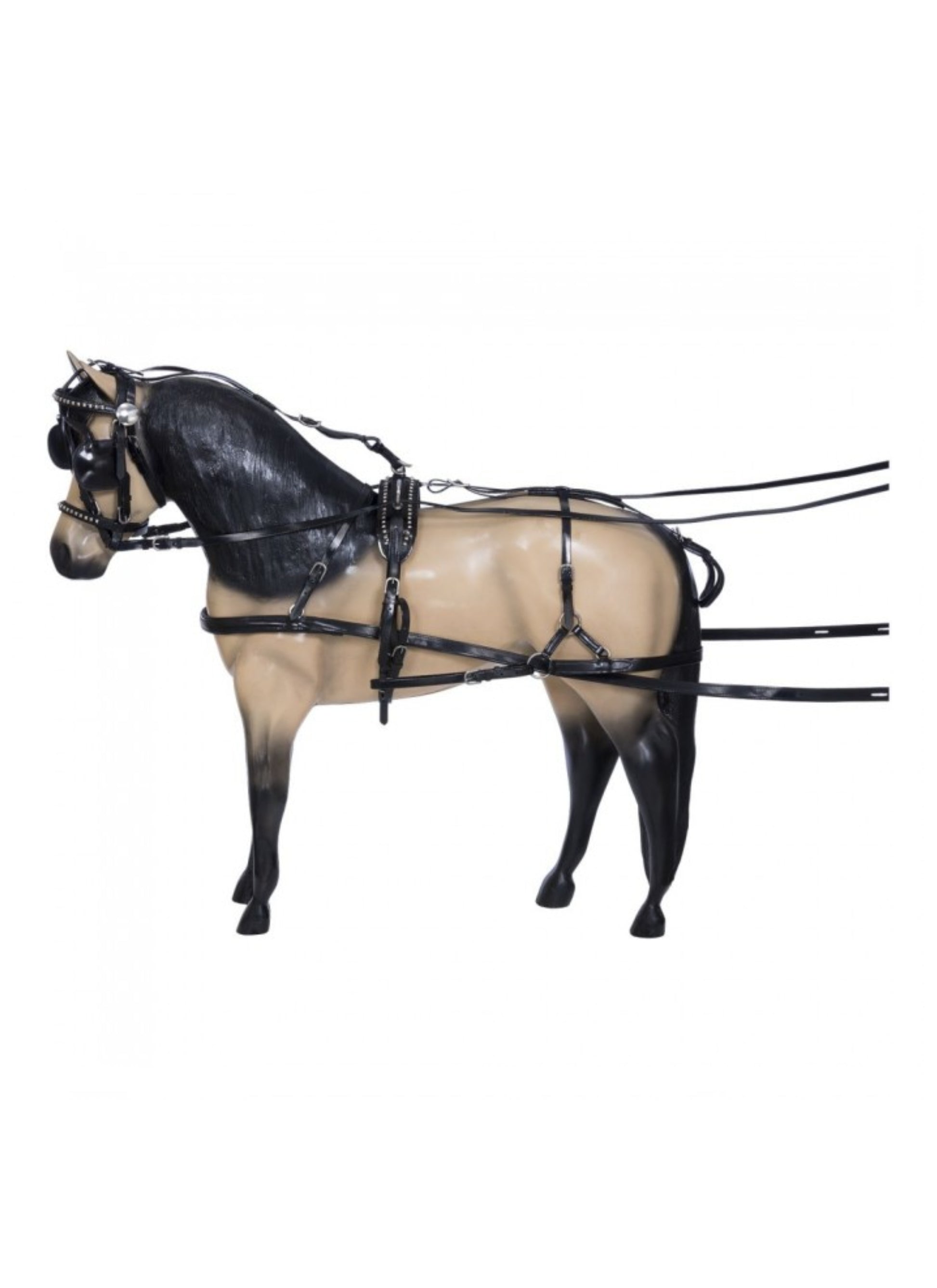Idéal pour le débutant. Le nylon enduit de vinyle facile à installer est idéal pour la conduite quotidienne et a également fière allure dans le ring d'exposition. Dos et plastron renforcés et rembourrés. Facile à nettoyer et à entretenir, il suffit de le tremper dans l'eau et de l'essuyer après utilisation. Comprend une bride avec des œillères, une bricole, une culasse et des traits de traction à un seul pli. Moins peu.