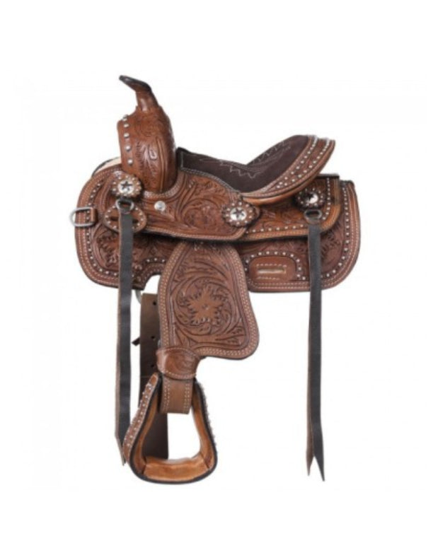 La selle Braden Trail de 8" est dotée d'outils floraux, de sièges en daim, d'embellissements à pois argentés et de conchos étoiles antiques avec superposition argentée. Des sangles en cuir et des garde-boues à outils floraux complètent le look.