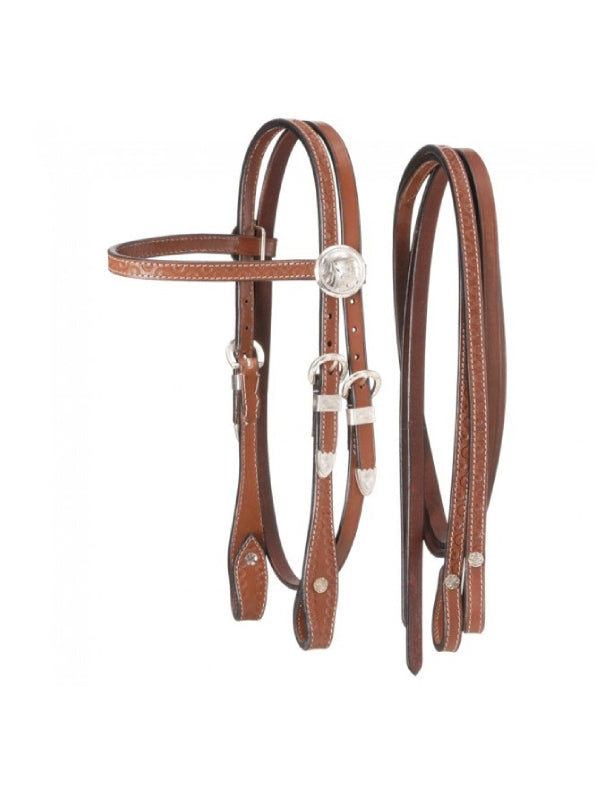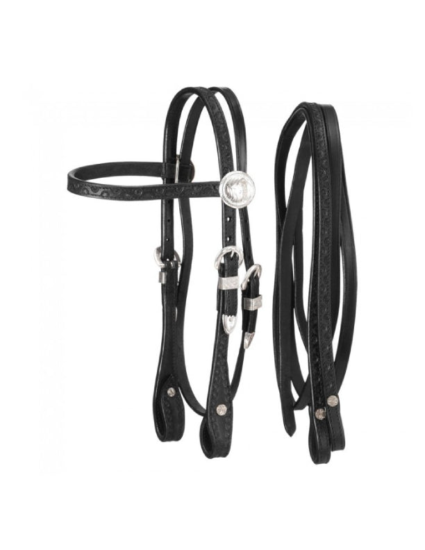 Bridon en cuir doublé et surpiqué souligné de conchos et embout/passe-boucle argentés. Outillage tressé. Les bords sont lissés et finis. Complet avec rênes.