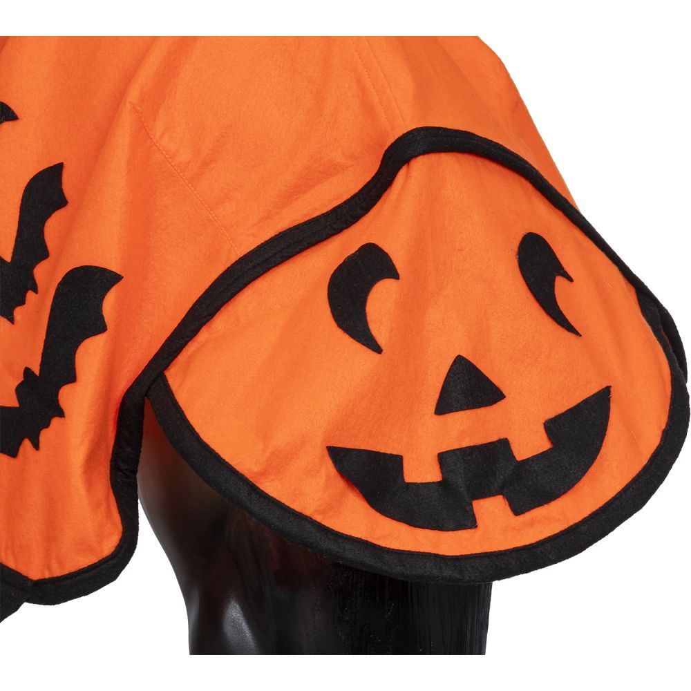 Get into the spooky spirit with your mini horse this Halloween! The bright orange felt is trimmed with black triangular tassels and cute orange poms. Black bat details on sheet corners and jack-o-lantern face on the tail flap complete this festive look! A front “Quick Grip” breast strap closure helps to keep this sheet in place. Great for holiday photos, fun shows, or parades! Fits most horses.