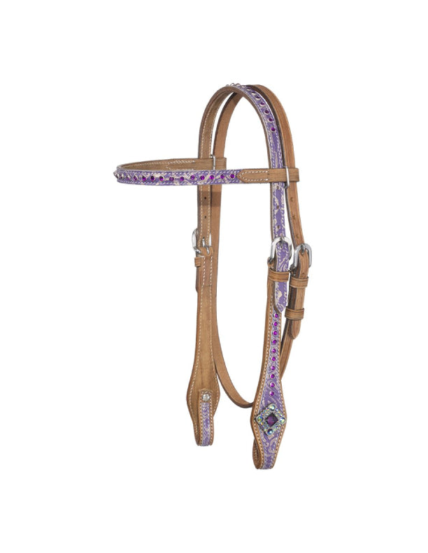 La collection Sweet Pea présente une superposition d'impression orale violette et dorée et des accents de points violets. Des conchos argentés avec des cristaux Swarovski irisés et des pierres précieuses violettes accentuent l'ensemble. Têtière miniature/poney haut de gamme.