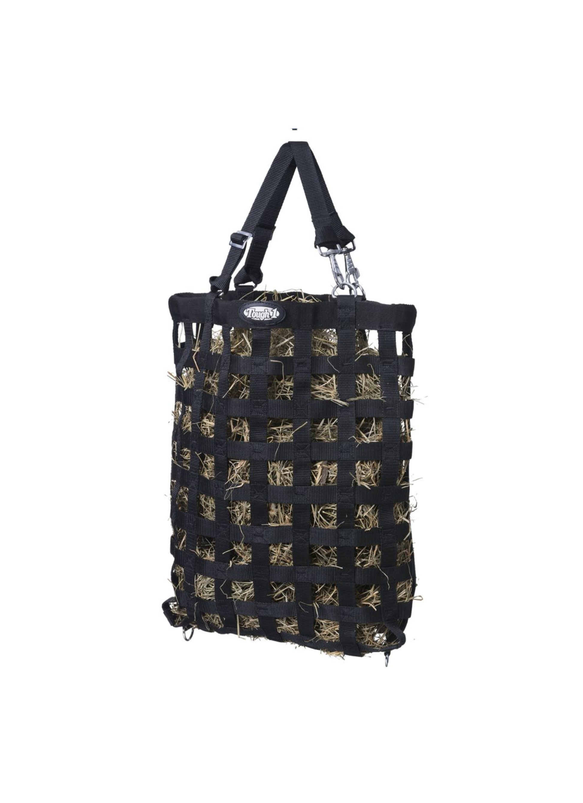 Mangeoire à foin à alimentation lente. Le sac entier est fabriqué à partir de 1 ? sangle avec de petites ouvertures 2 x 2 pour ralentir le cheval pendant qu'il mange, créant moins de déchets. Le cadre en plastique en sangle sur le dessus facilite le chargement du foin. Sangle de suspension réglable avec boutons-pression aux deux extrémités pour fermer le haut du sac à foin afin que le cheval ne puisse pas faufiler le foin par le haut. Comprend une sangle au bas du dos pour fixer le sac au décrochage ou à la remorque pour l'empêcher de tourner.