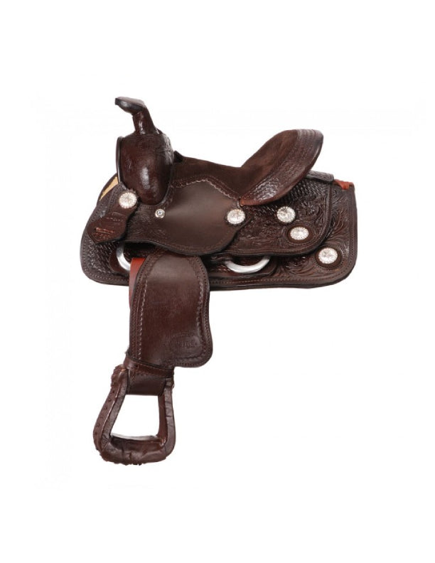 Selle de trail western miniature avec conchos. Siège de 8 ". Conçu avec le petit cavalier et le cheval miniature à l'esprit.