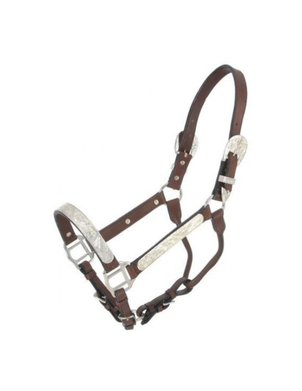 Beau cuir de bride rehaussé d'une garniture, d'une boucle, d'une pointe et d'un passant en argent brillant gravés à la main. Double couture pour plus de durabilité.